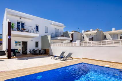 Modernt og fint feriehus i Denia, Costa Blanca, Spania med privat svømmebasseng for 6 personer. Huset befinner seg på i et urbant kystområde og nær restauranter og barer, butikker og supermarkeder.