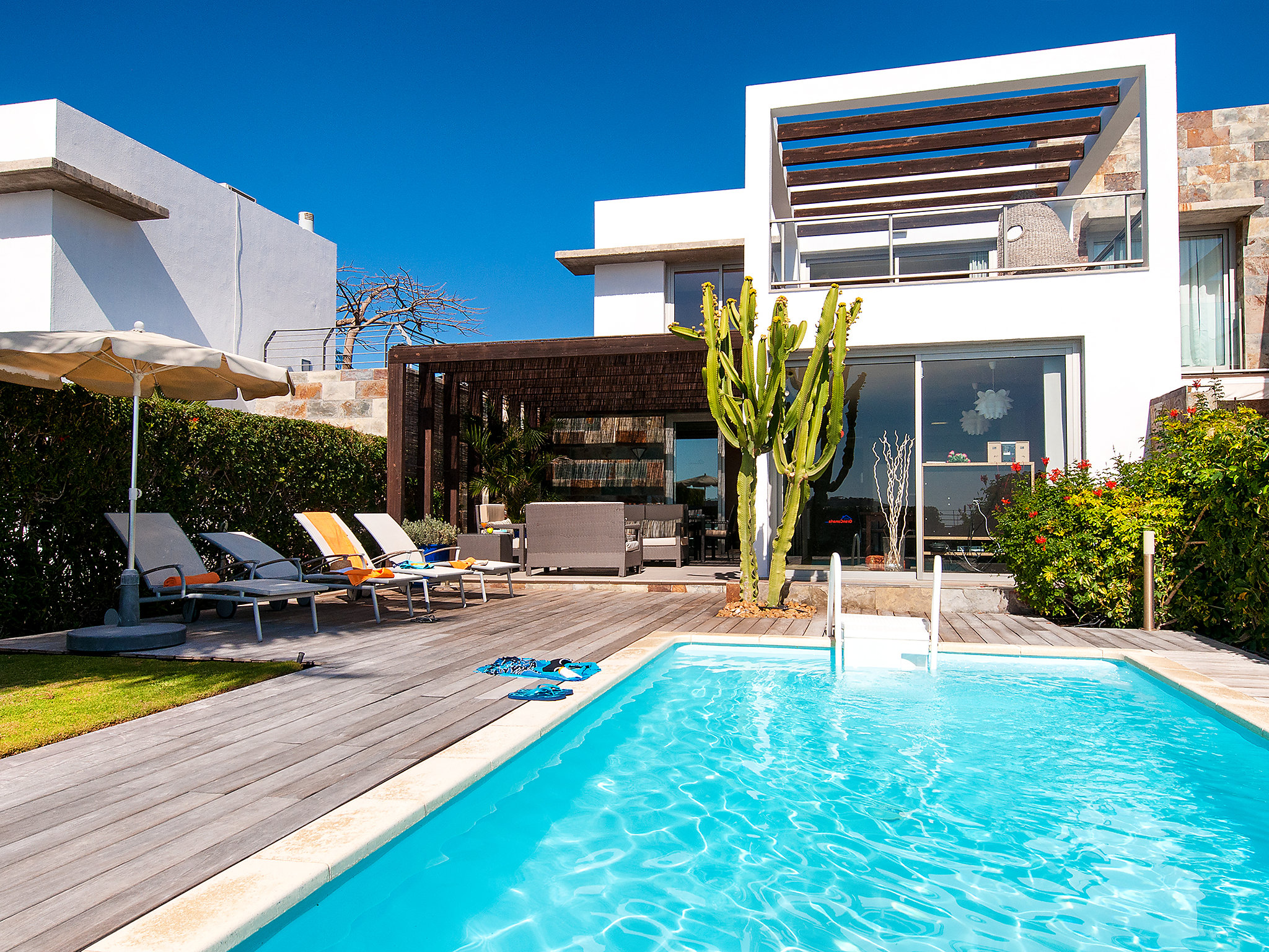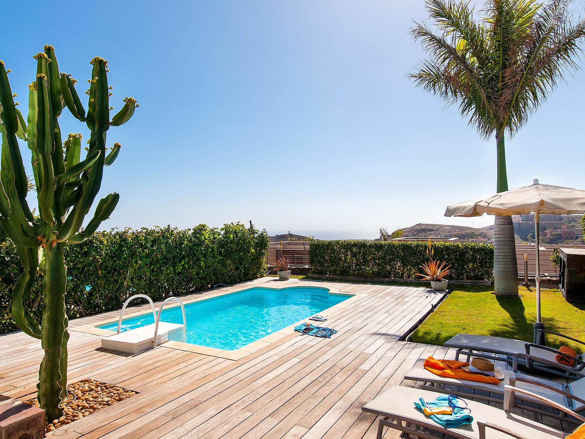 Swimming pool heating at a cost of 20 Euros/night. House maid on request (extra). Welcome pack ( inclusive). Stor, moderne, koselig villa "Golfers 14". House Equipment: airconditioning, washing machine (private use), tumble dryer (private use). Access & Parking: private parking. All-season motor access to the house. Car recommended. Situation: of Salobre Golf Resort, above Maspalomas, quiet, elevated, sunny position. View from the apartment of havet og fjellene. Surroundings of the house: grounds (private use, fenced), garden (private use), lawn (private use), swimming pool (private use, heated), barbecue (private use). Facilities and distances: sandy beach 3 km, golf course 50 m.